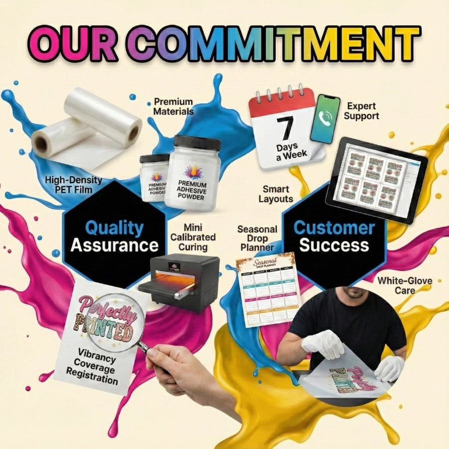 Quality assurance begins with high-density PET film, premium adhesive powders, and calibrated curing ovens that lock in stretch-friendly finishes. Each transfer panel is inspected for vibrancy, coverage, and registration so you receive flawless prints ready to apply.