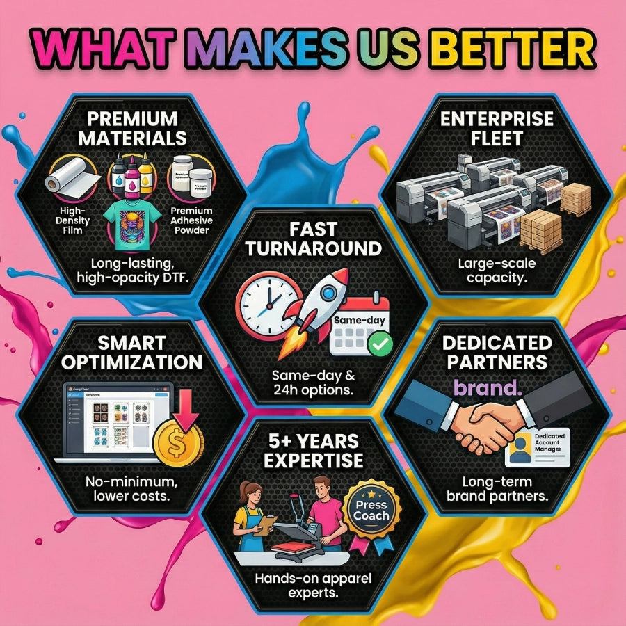 Our customer success team is on-call seven days a week to help you size artwork, choose the ideal gang-sheet layout, or plan inventory for seasonal drops. We treat every project-single proofs to nationwide rollouts-with the same white-glove care so you can trust every press.