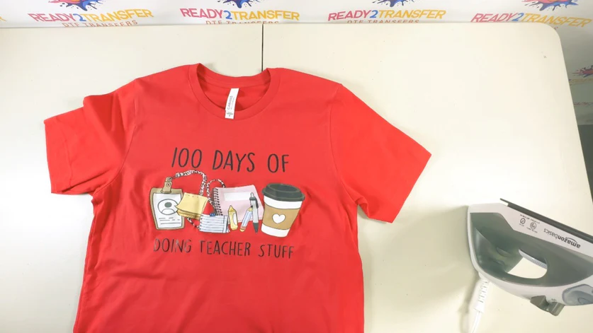 Place the DTF transfer, and follow heating instructions down below. When the iron has reached the desired temperature, apply hard pressure evenly to the transfer.
