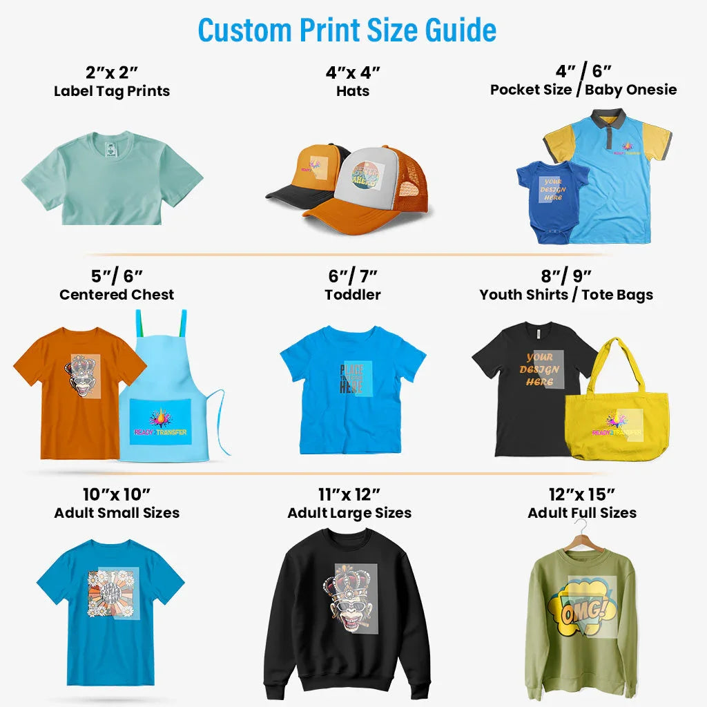 Upload your artwork and get a custom DTF transfer by size. perfect for resellers, brands, and custom t-shirt businesses.