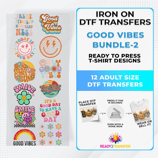 Good Vibes Bundle Iron on DTF Transfer Bundle 2 - 12 Best Seller Ready To Press T-shirt Designs