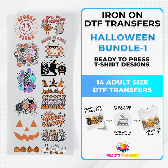 Halloween Bundle Iron on DTF Transfer Bundle 1 - 14 Best Seller Ready To Press T-shirt Designs