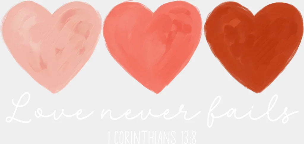 Love Never Fails Valentines DTF Transfer - Adult Unisex - S & M (10") / Black is backordered and will ship as soon as it is back in stock.