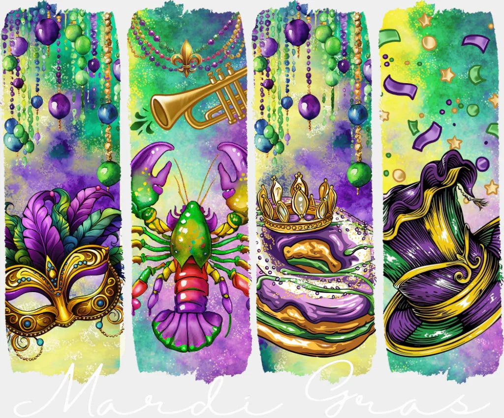 Bring vibrant fun to your apparel with our Mardi Gras Mask, Lobster, Donut & Hat - Mardi Gras DTF Transfer. Designed as a versatile iron on DTF Transfer, this custom DTF transfer makes creating t-shirts, hoodies, and accessories effortless with its premium heat transfer technology. Perfect for unique t-shirt printing projects, this DTF transfer ensures vivid, detailed designs that stand out and last through countless washes.
