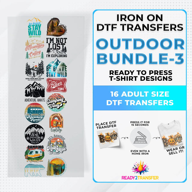 Outdoor Bundle Iron on DTF Transfer Bundle 3 - 16 Best Seller Ready To Press T-shirt Designs