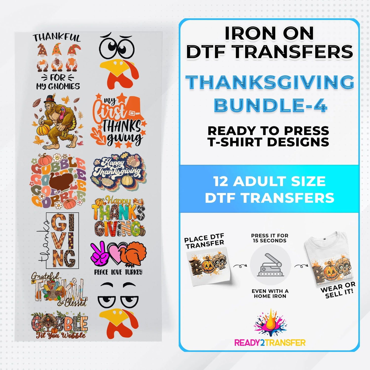 Thanksgiving Bundle Iron on DTF Transfer Bundle 4 - 12 Best Seller Ready To Press T-shirt Designs