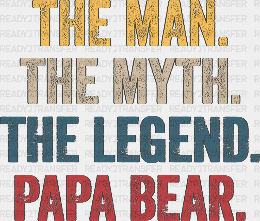 Father's Day Ready To Transfer DTF Designs, Father's Day, The Man The Myth The Legend, No Minimums. Custom DTF designs, easy to apply. Create your custom T-shirt in seconds.